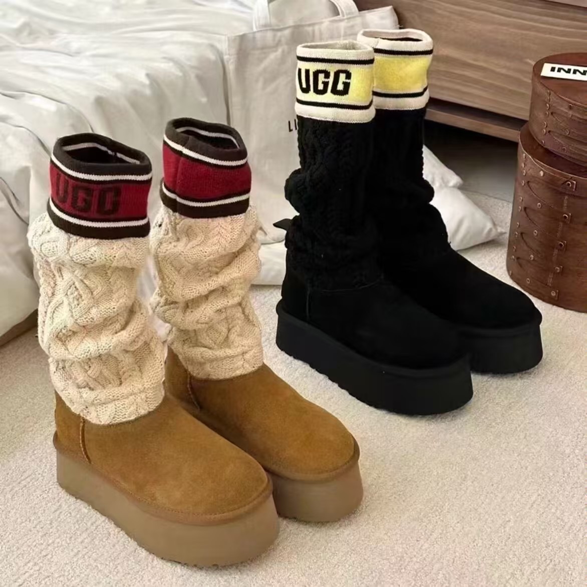 杨幂同款UGG Letter Tall 休闲舒适棕白红袜套靴女款显瘦雪地靴